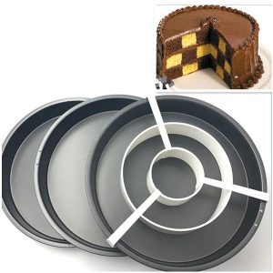 The set includes three 24cm x 4cm cake pans plus the dividing ring, making three-layer checkerboard cakes easy to bake and create.