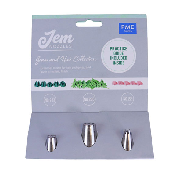 - Set includes: Nozzle no. 233 – To create realistic grass for football-themed cakes and more; Nozzle no. 22 – Use to pipe swirls and shells with various mediums, Nozzle no. 235 – Create realistic looking hair for cakes.