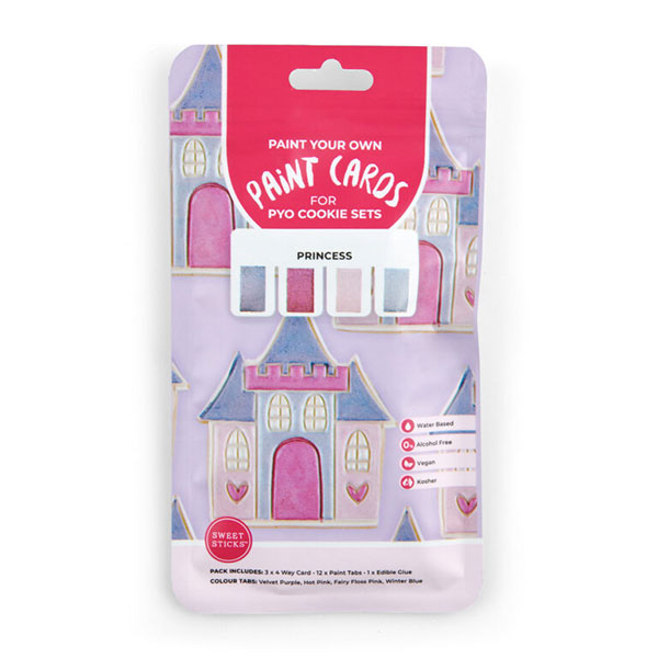 Princess colours include: – Velvet Purple – Hot Pink – Fairy Floss Pink – Winter Blue To assemble your paint cards: Take all items out of the packaging and lay flat facing upright. Cut open glue. On your four way card place 1 drop of glue onto the centre of each panel. Gently press and straighten each paint tab onto card. Allow 6+ hours to dry. One complete 4 way paint card has enough paint to cover 2-4 large cookies. Sweet Sticks PYO packs are child friendly and safe to consume making it the perfect edition to your weekend antics with the kids or to add to your PYO Cookie Kits. How to paint: When ready to paint add 1-2 drops of water onto each paint tab. Allow 1 minute for the paint to activate. When activated, stir well and paint. If paint dries out, repeat previous steps. Pack includes: 3 x 4 Way Cards 12 x Paint Tabs (4 Colours) 1 x Edible Glue